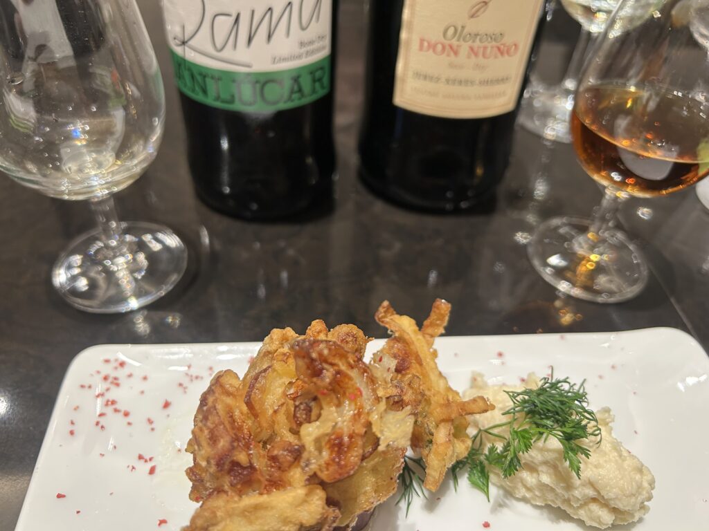 シェリー酒に欠かせない酵母「フロール」白い花のようなのでマッシュルームチップスをチーズに添え